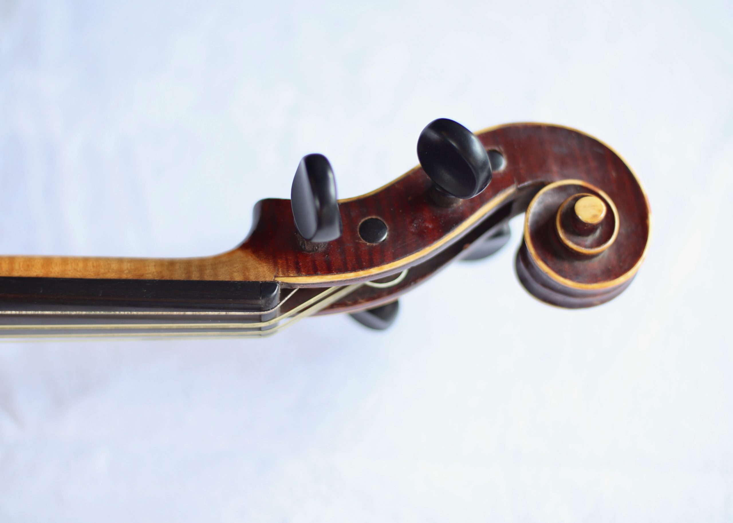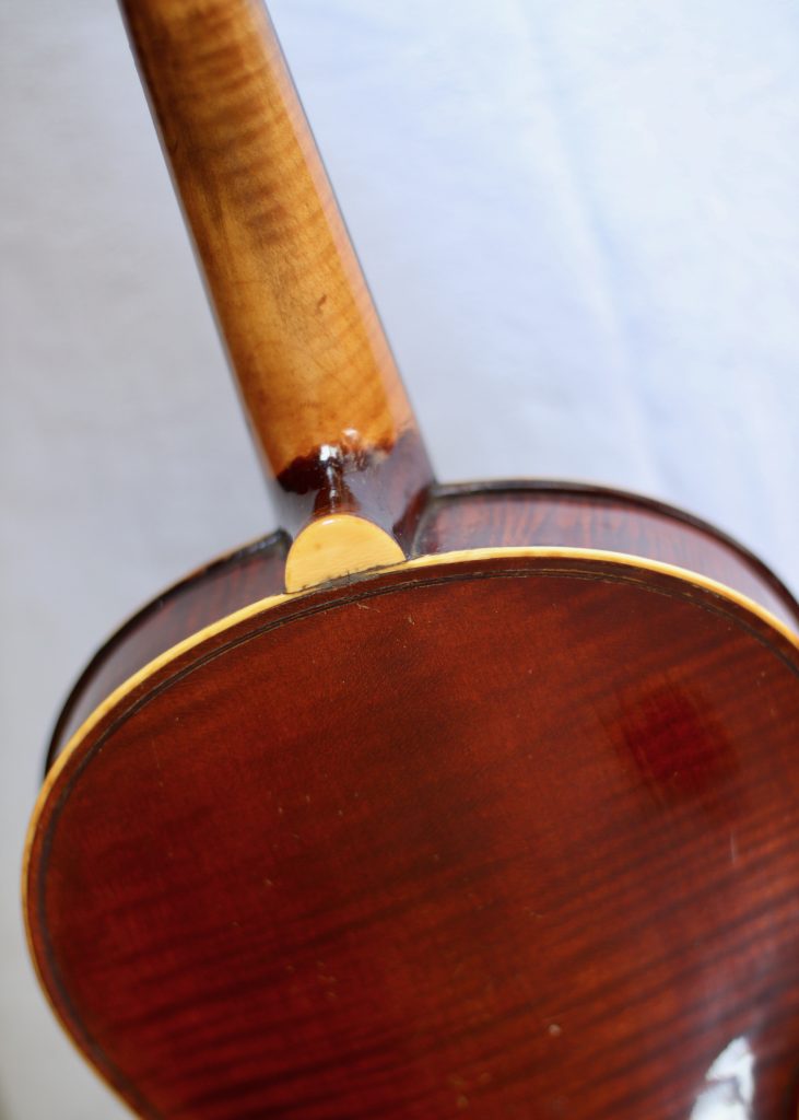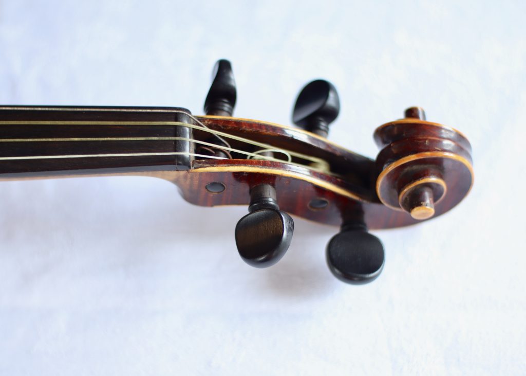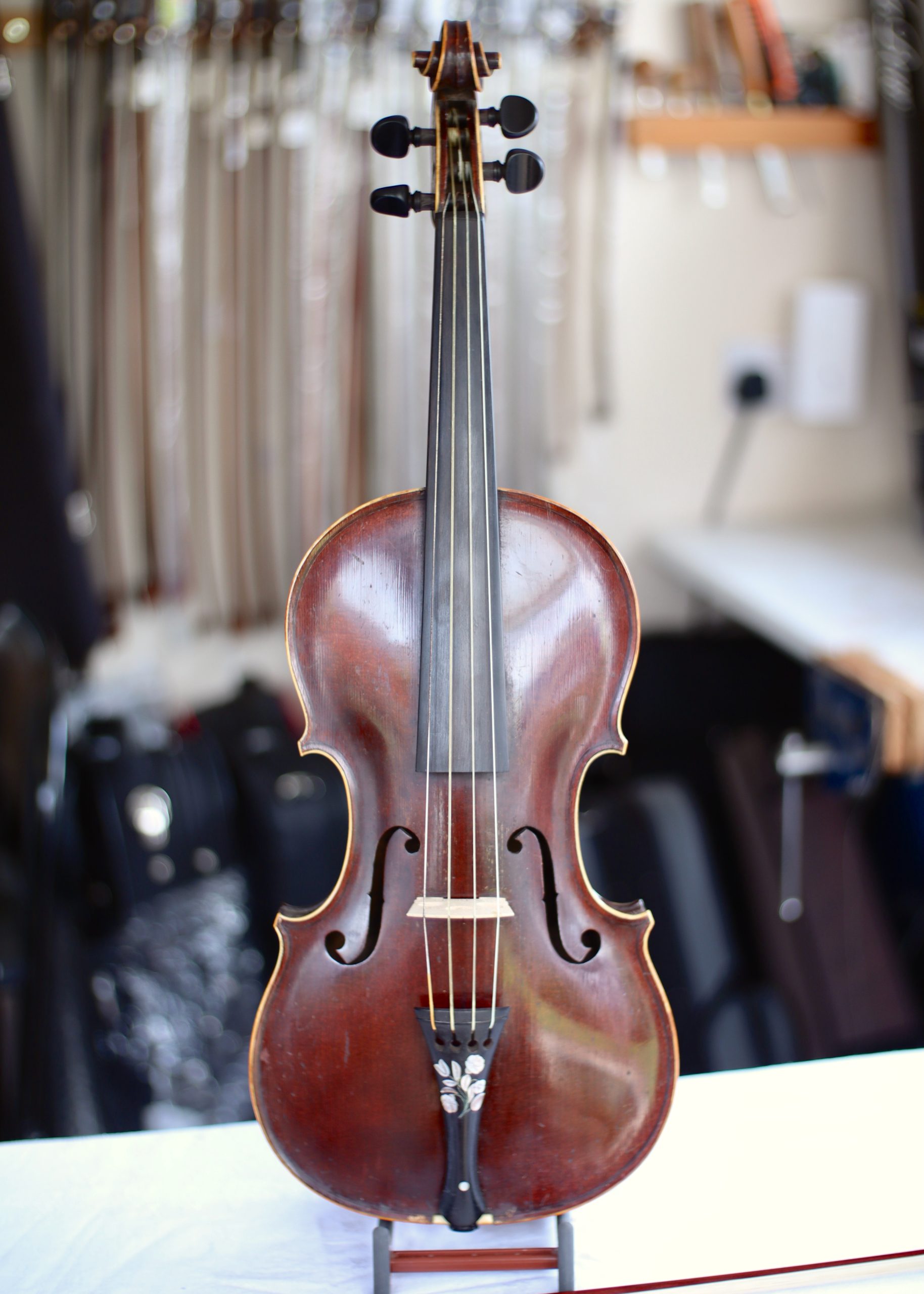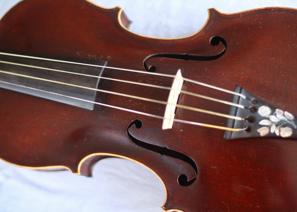 This lovely violin is fitted with gut strings and has a gorgeous mother of pearl inlay on the tailpiece. Perfect for the baroque music player or anyone looking for something slightly different.