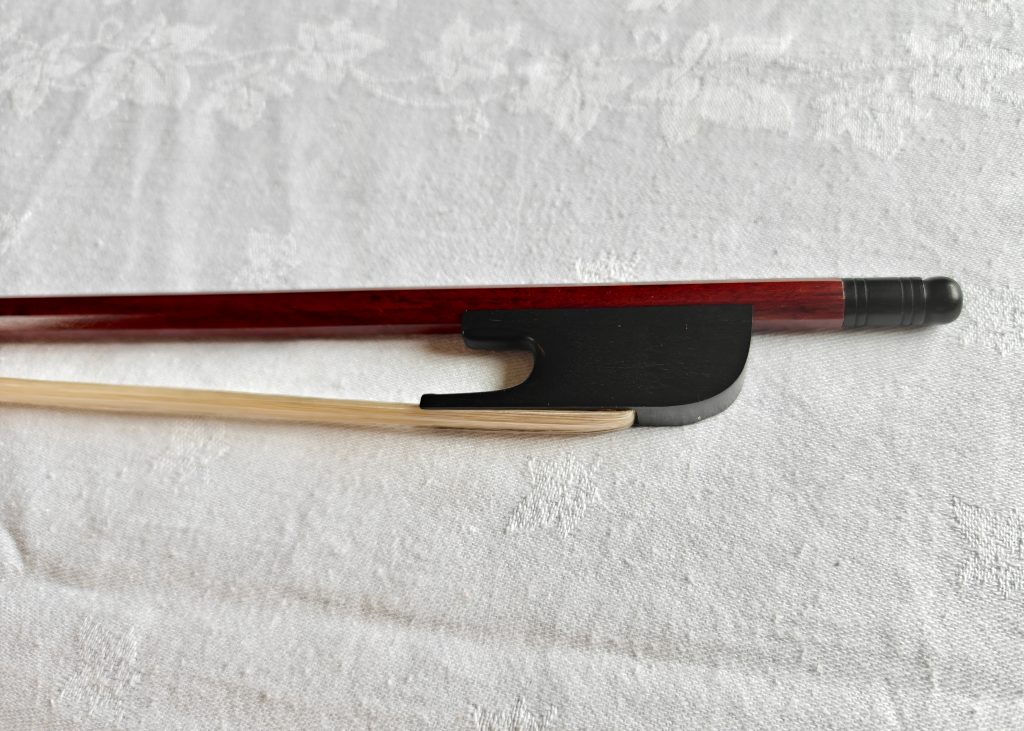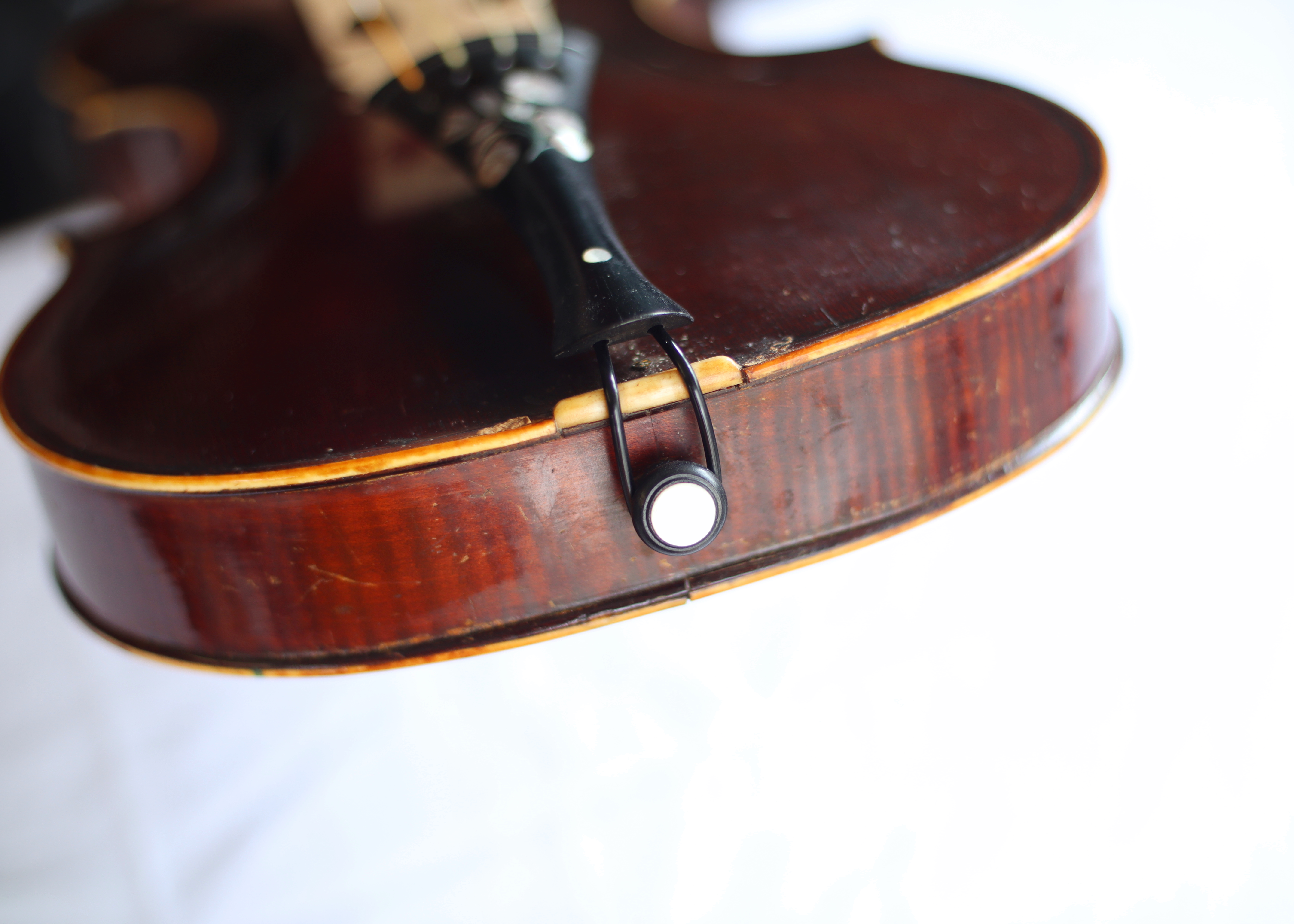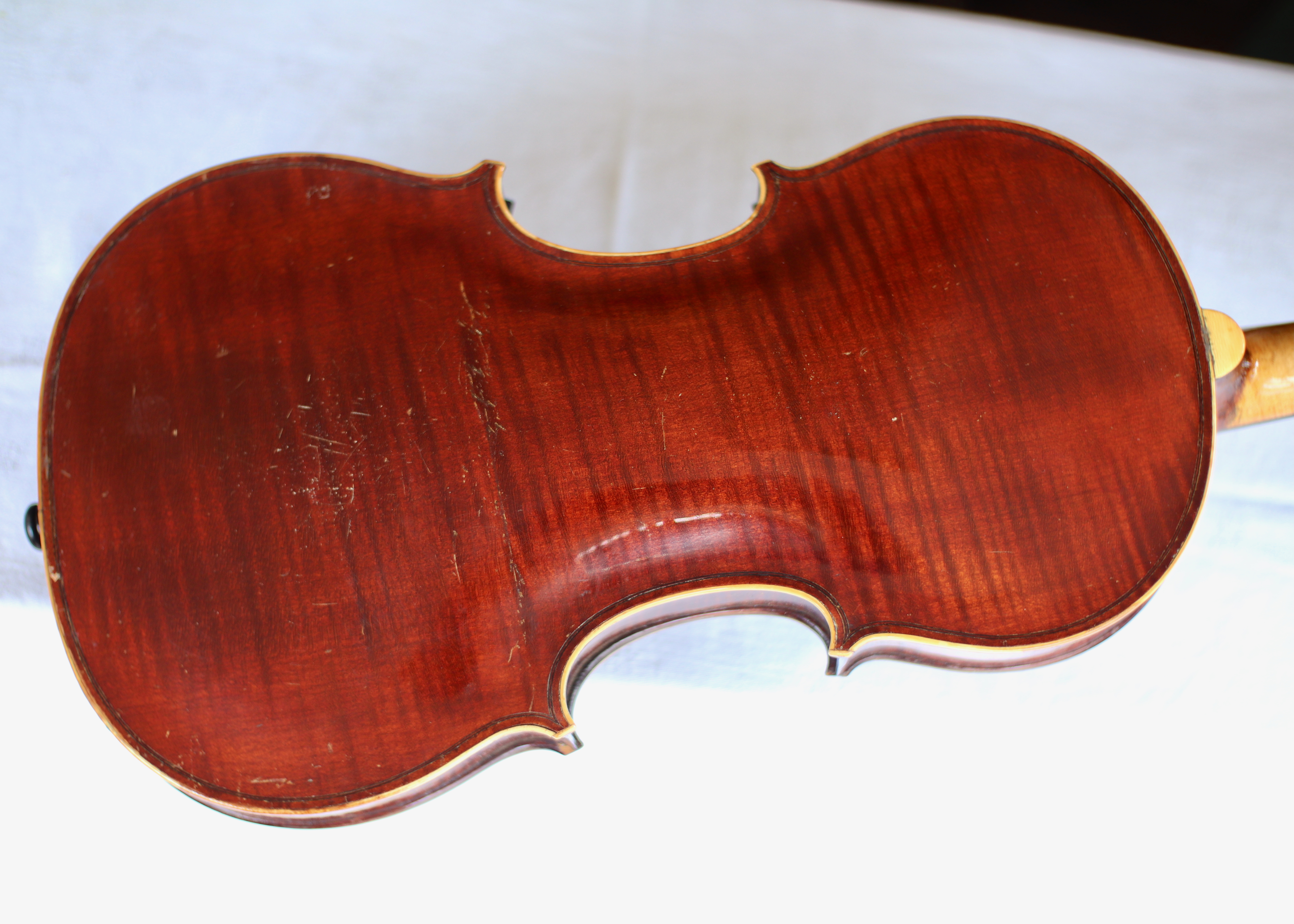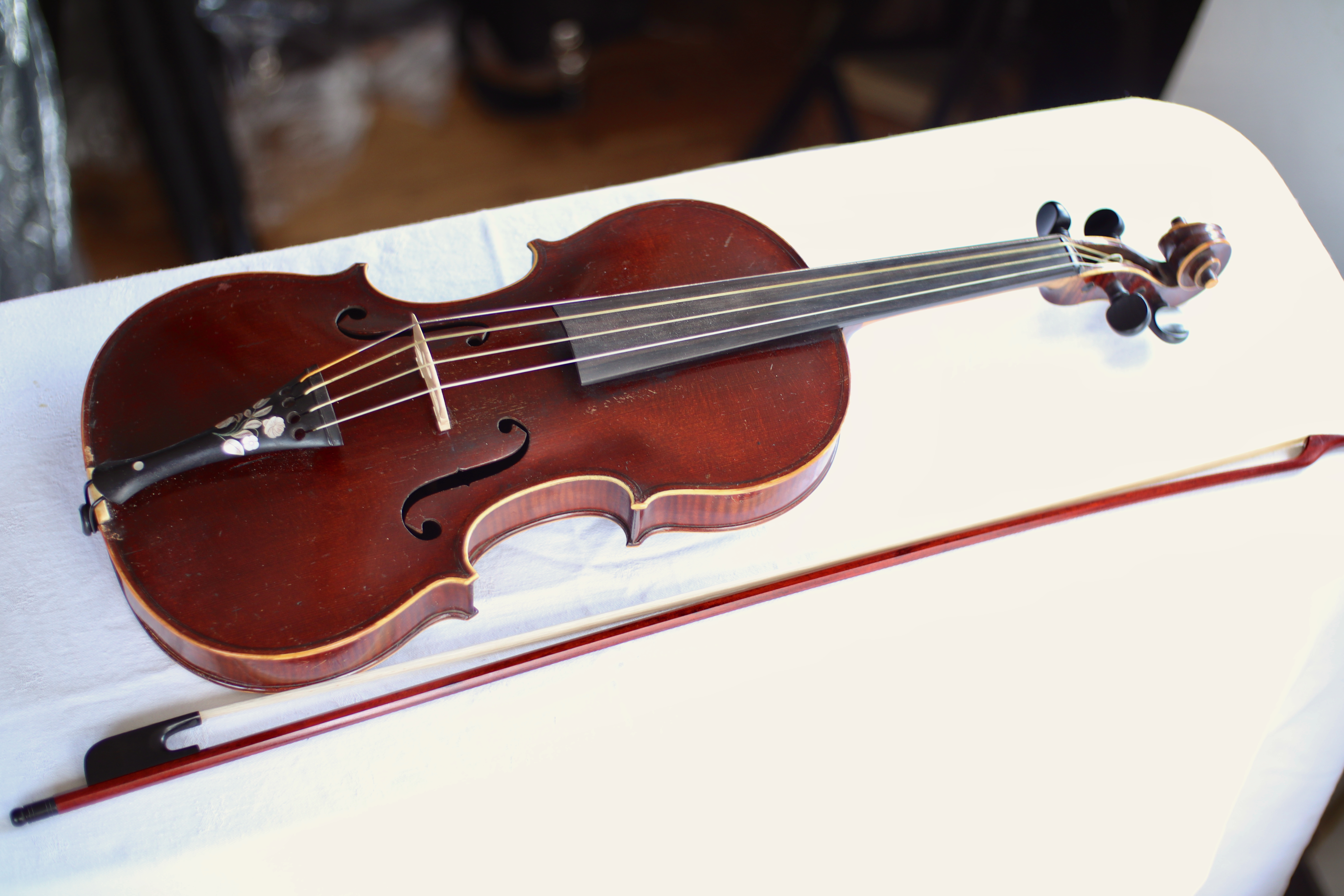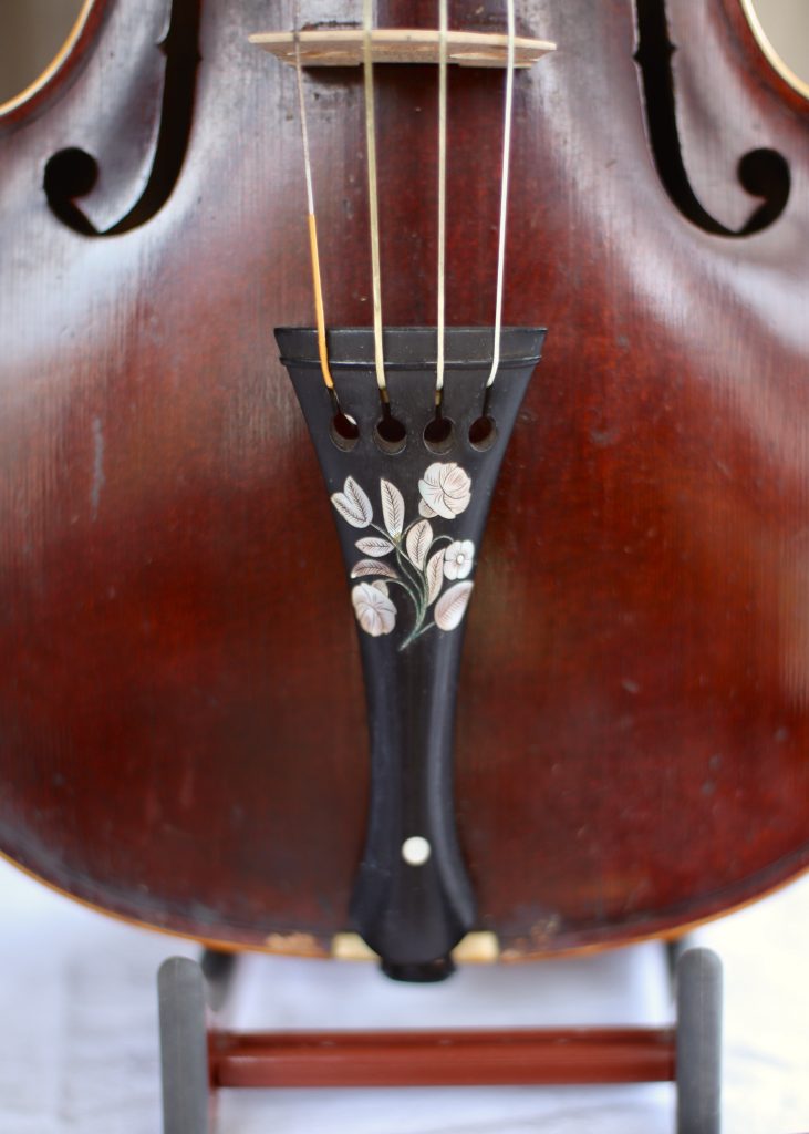 This lovely violin is fitted with gut strings and has a gorgeous mother of pearl inlay on the tailpiece. Perfect for the baroque music player or anyone looking for something slightly different.